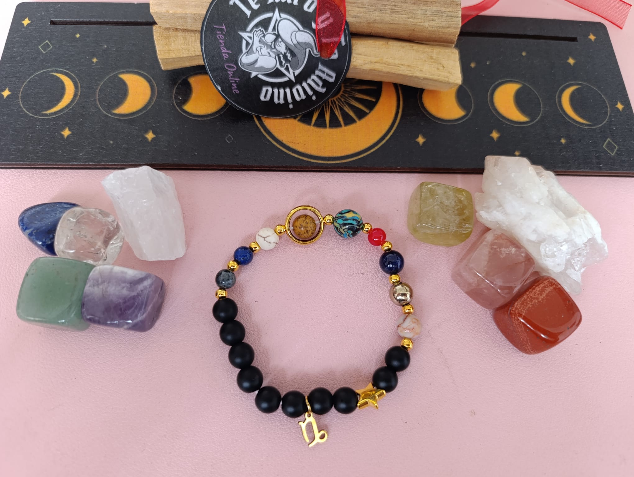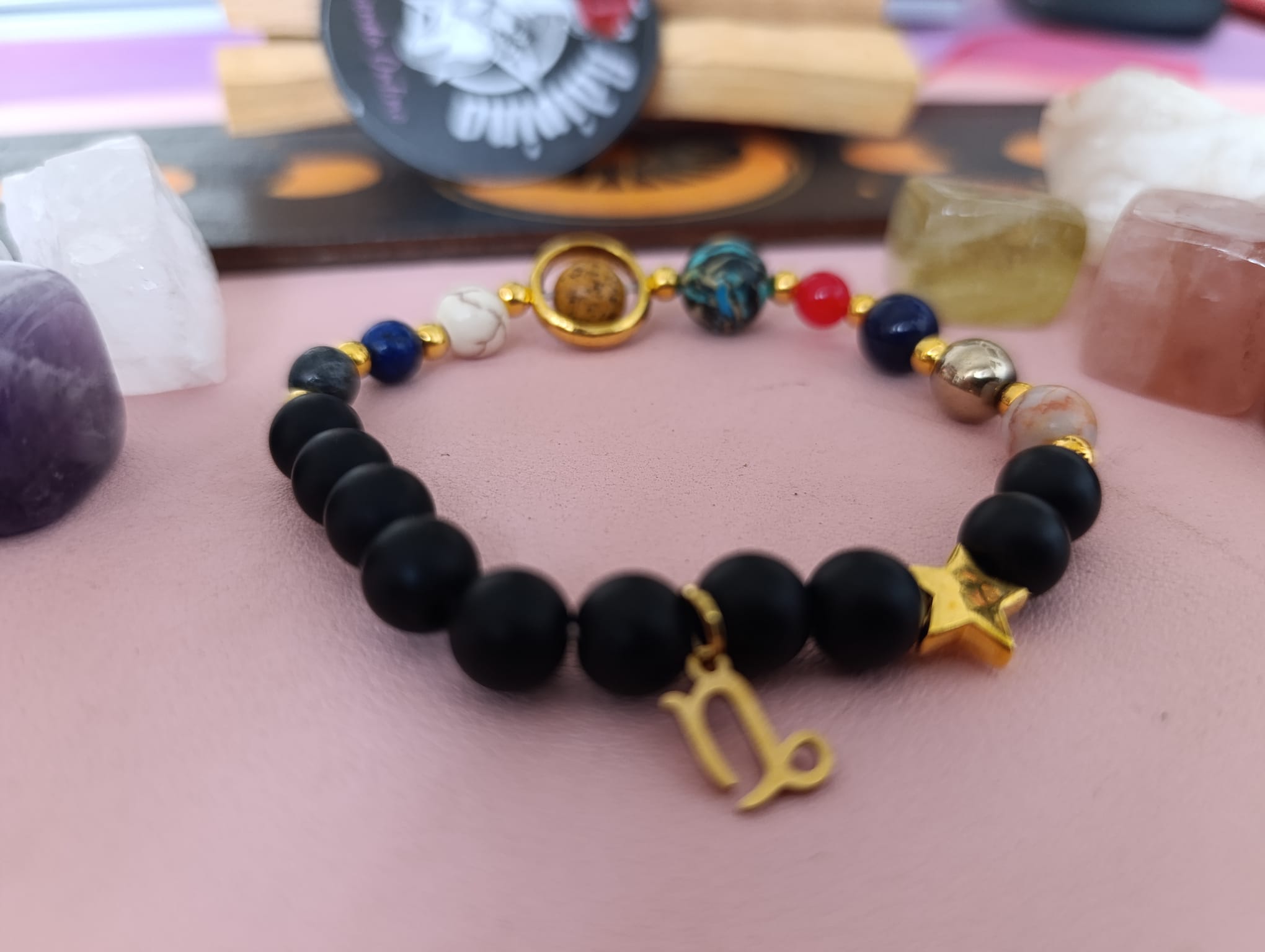 Pulsera de obsidiana negra con constelaciones de planetas. Detalle de charm dorado con el signo Capricornio.