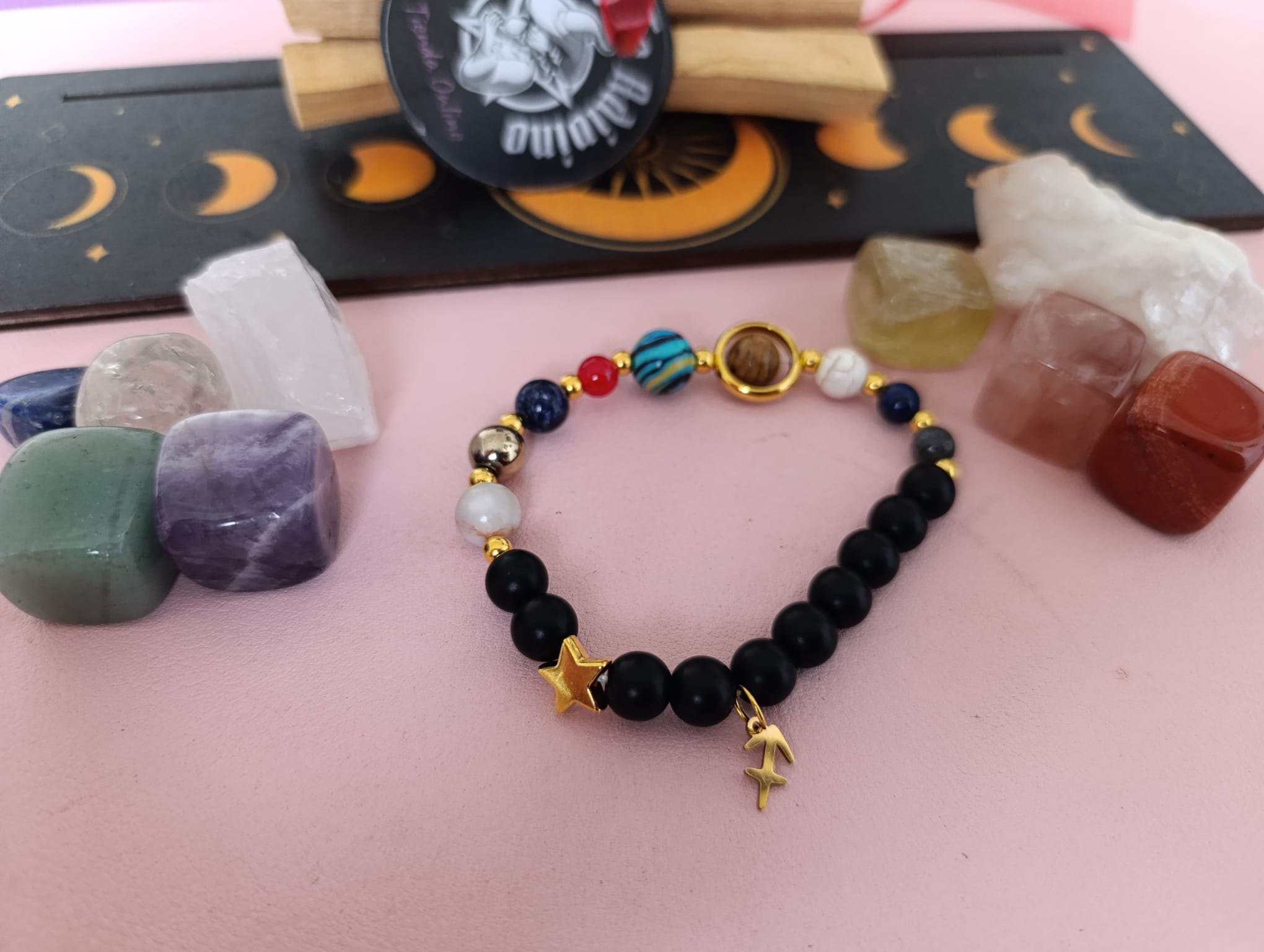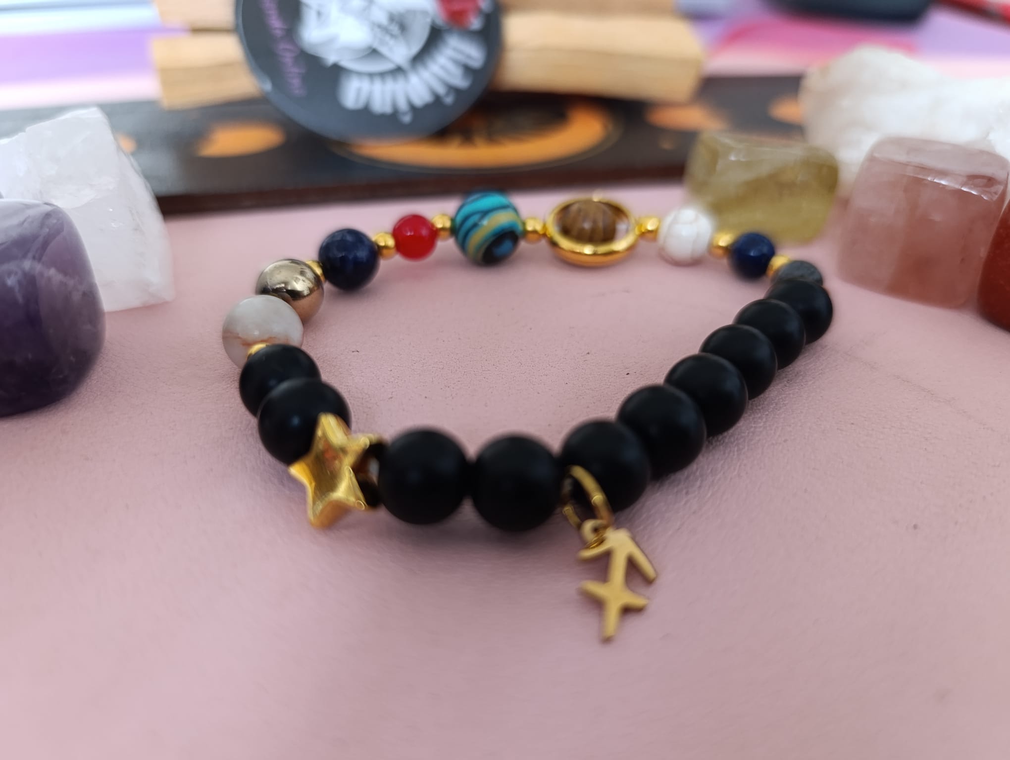 Pulsera de obsidiana negra con constelaciones de planetas. Detalle de charm dorado con el signo Sagitario.
